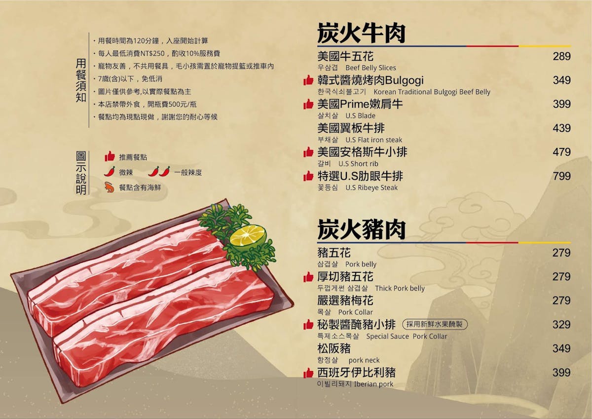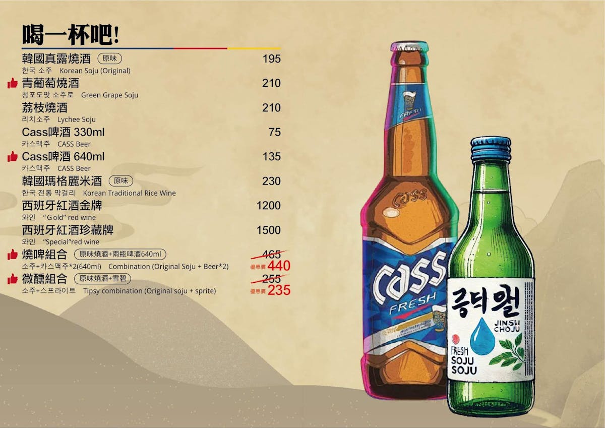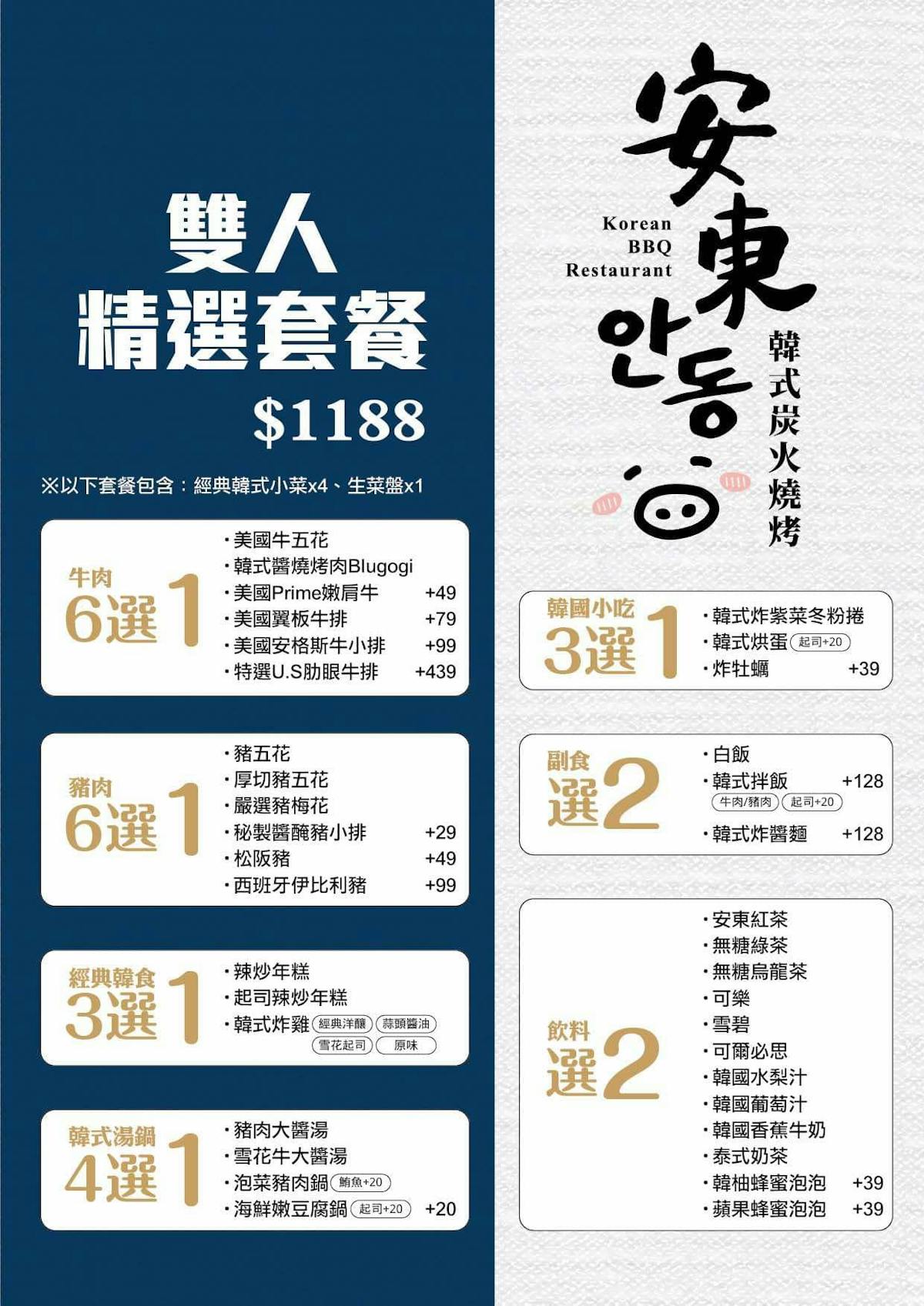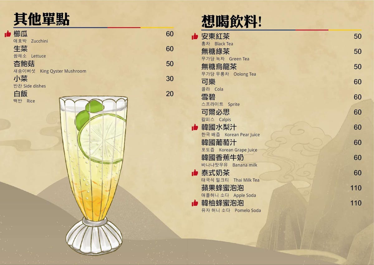 內含牛肉 6選1、豬肉 6選1、經典韓食 4選1、韓式湯鍋 4選1、韓國小吃 3選1、副食 1、飲品 2。