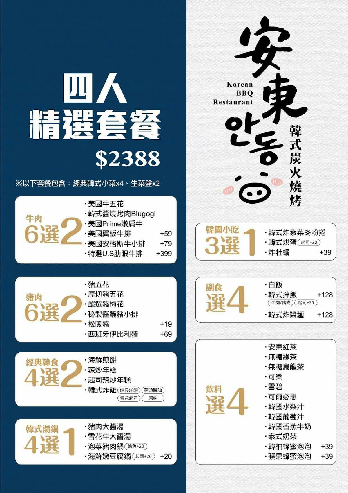 四人份超值精選:牛肉、豬肉各 6選1、經典韓食 4選1、湯鍋 4選1、韓國小吃 3選1、副食 4、飲品 4。